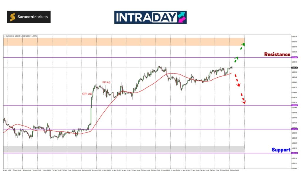 Dapat diperhatikan pada carta pasangan mata wang EUR/USD, harga bergerak perlahan di bawah paras 1.09600 yang merupakan rintangan diuji minggu lalu.