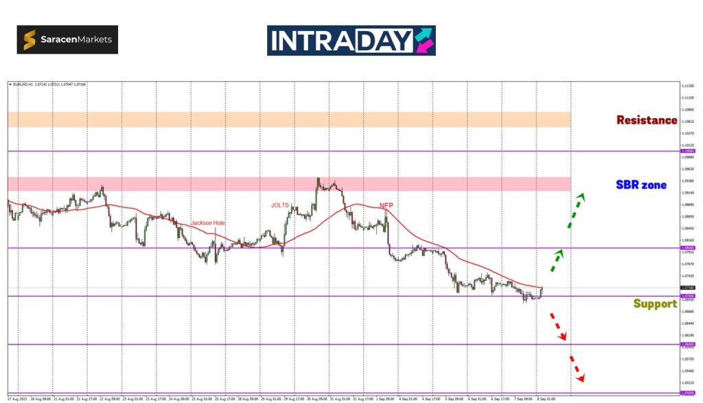 Sekiranya harga jatuh lebih rendah di bawah zon 1.07000, penurunan boleh diteruskan lagi hingga menuju sasaran pada 1.06000.