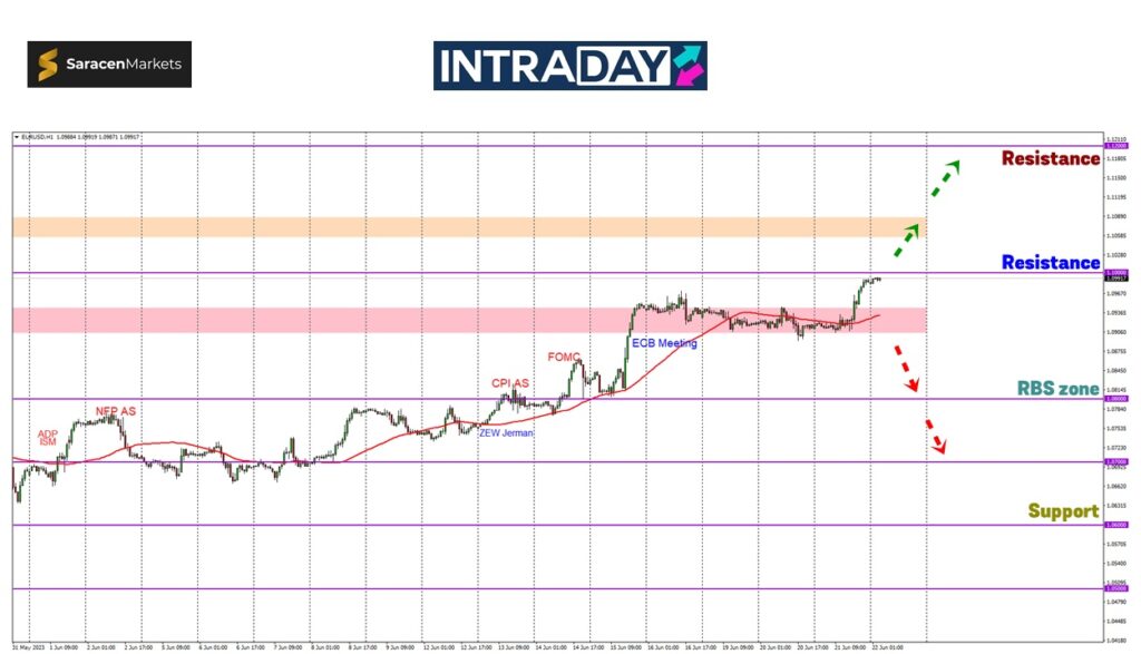 Jika harga berjaya melepasi rintangan pada 1.10000, kenaikan lebih tinggi dilihat akan menuju pula ke sekitar 1.10700 untuk menguji zon tersebut.