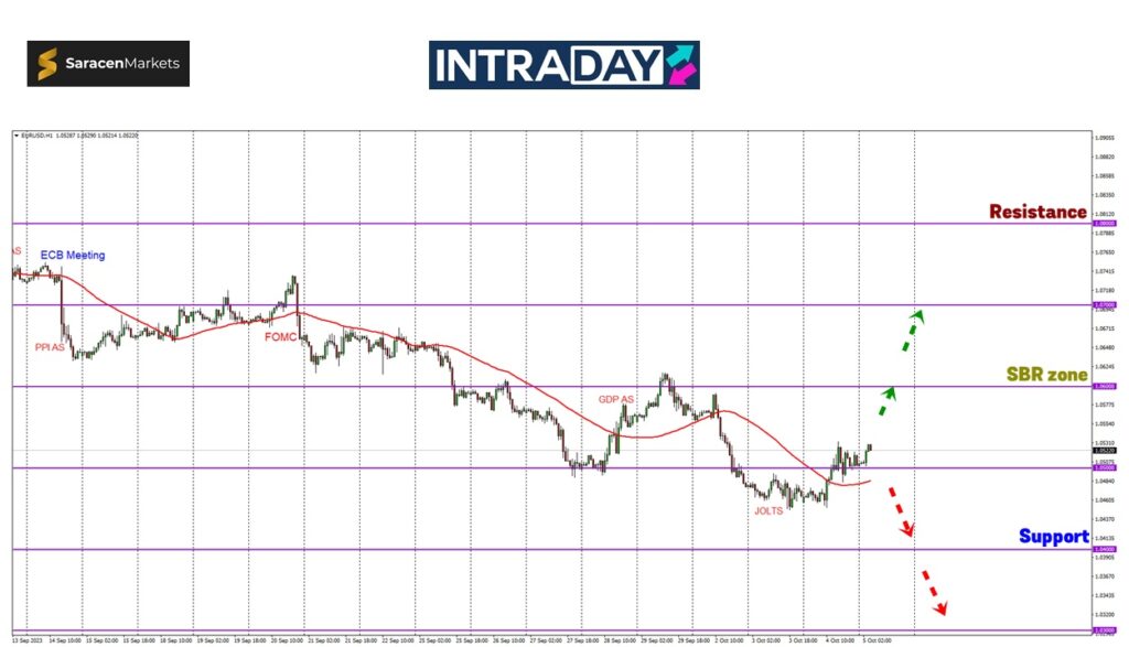 Pelabur berwaspada untuk isyarat perubahan trend bullish setelah harga berjaya melepasi halangan Moving Average 50 (MA50) pada rangka masa 1 jam di carta itu selain harga juga turut menembusi paras 1.05000.