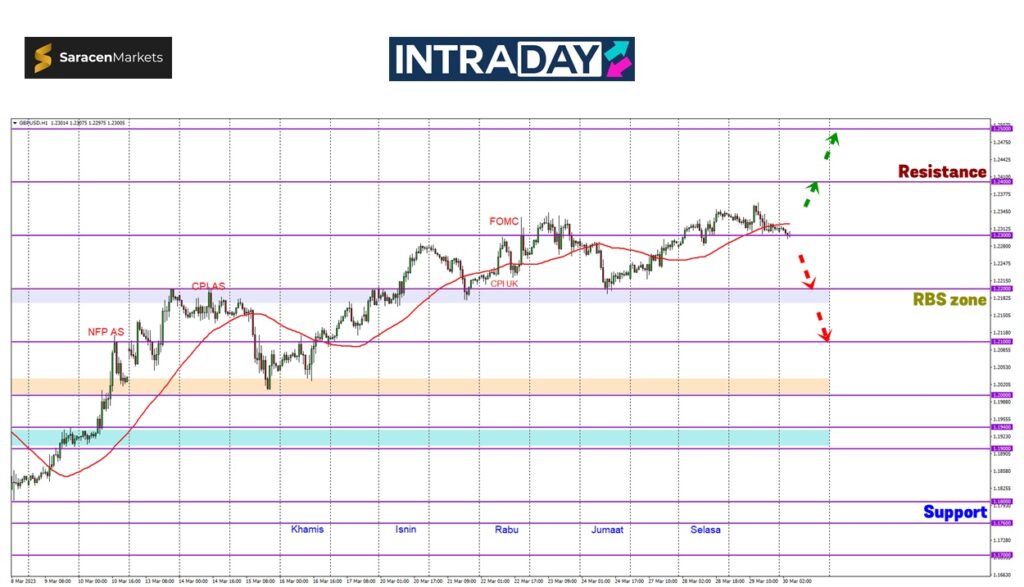 Jika penurunan harga diteruskan di bawah paras 1.23000, harga dilihat bakal mencecah semula ke paras 1.22000 untuk menguji zon RBS (resistance become support) tersebut.
