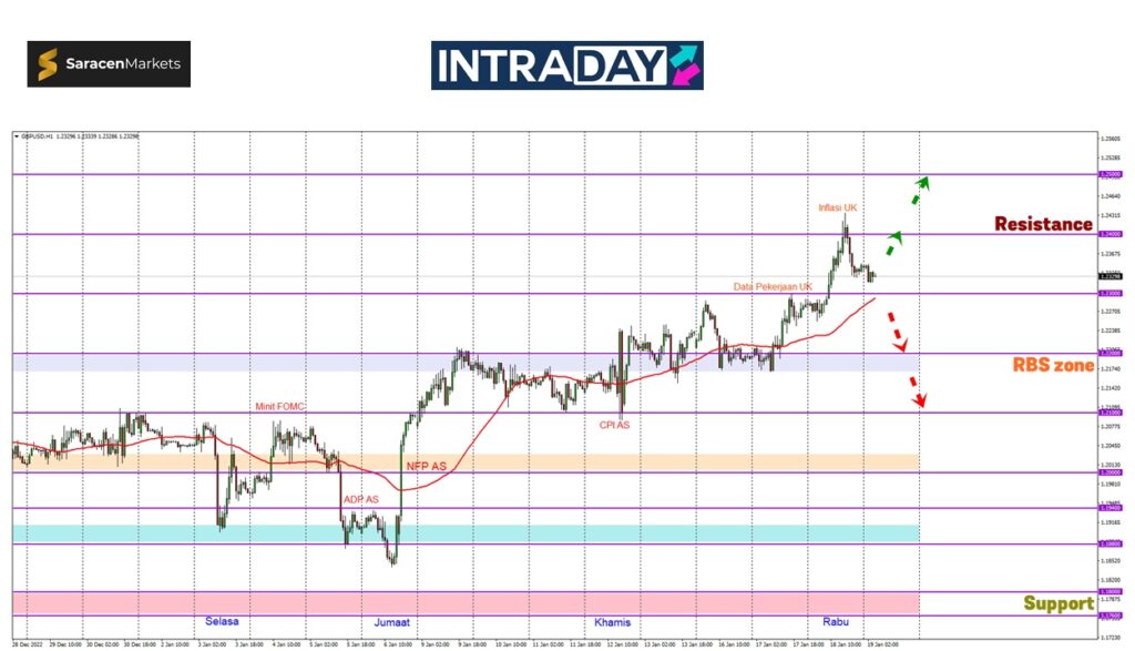 Namun waspada sekiranya corak mula berubah dengan harga mula membuat penurunan di bawah paras 1.23000 semula.