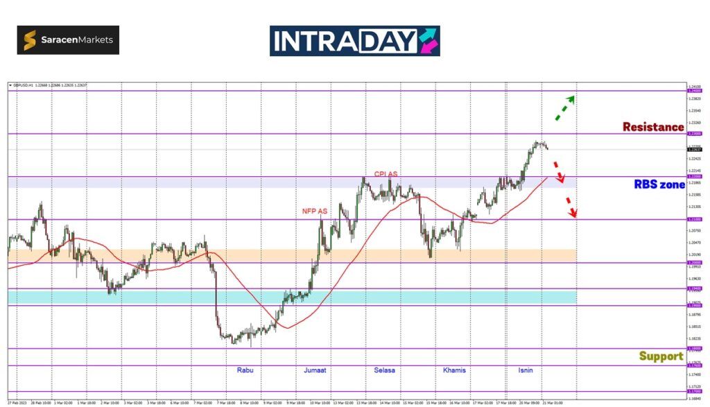 Namun jika berlaku penurunan harga semula, paras 1.22000 yang berada pada zon RBS (resistance become support) bakal memberi reaksi yang menarik buat harga.