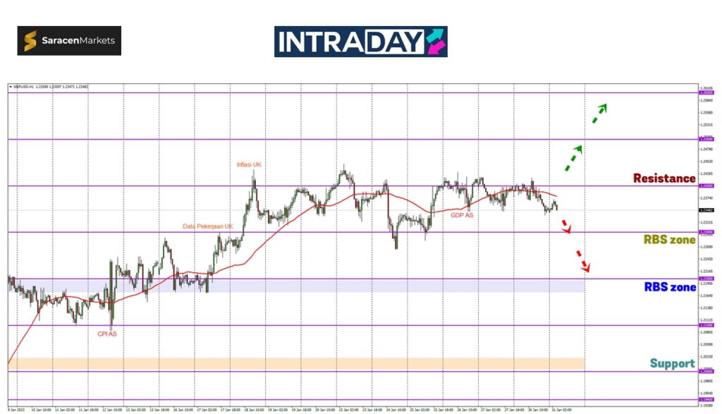 Jika corak penurunan diteruskan, harga dilihat akan menuju ke sekitar 1.23000 untuk menguji zon RBS (resistance become support) tersebut.