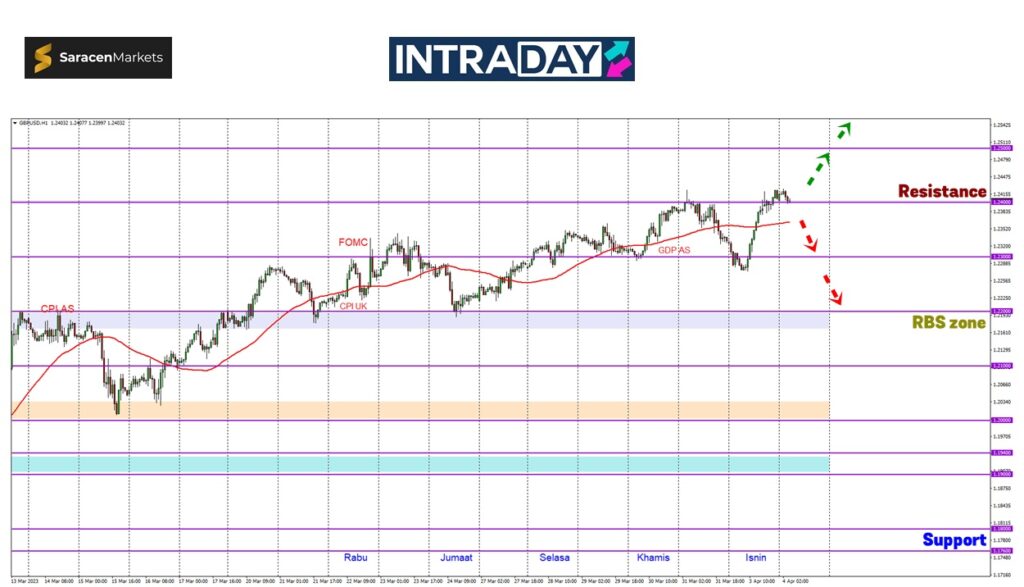 Jika tembus lebih rendah, harga akan kembali menuju zon RBS (resistance become support) tumpuan sebelum ini iaitu pada 1.22000.