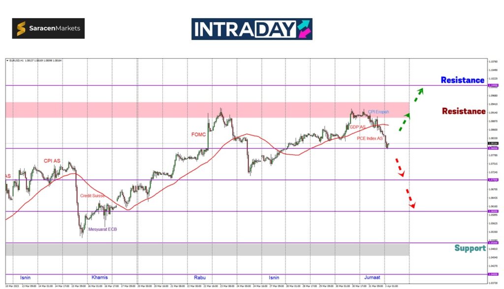 Jika US dolar kekalkan pengukuhan dan menekan harga jatuh lebih rendah di bawah paras 1.08000, penurunan dilihat boleh dilanjutkan menuju zon sokongan seterusnya pada 1.07000.