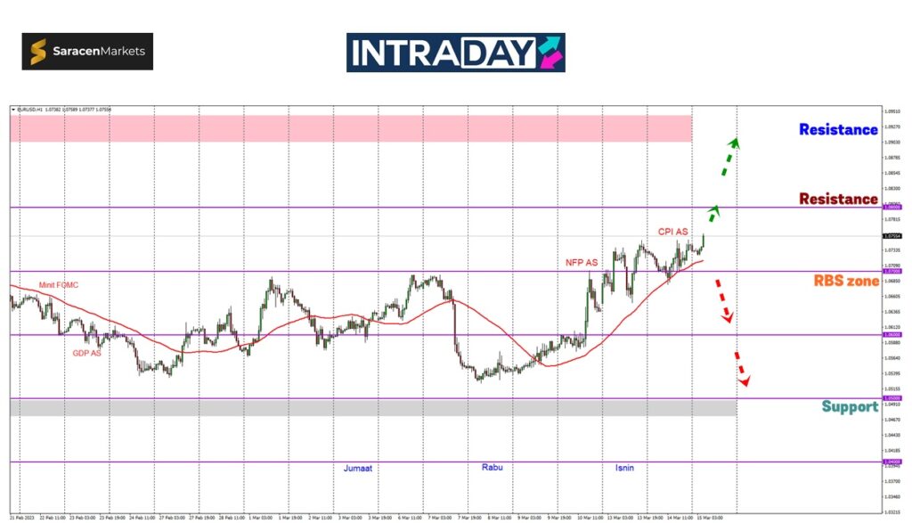 Untuk jangkaan bagi penurunan semula, harga dilihat akan kembali singgah ke paras tumpuan 1.06000 atau menuju sehingga ke zon support 1.05000.
