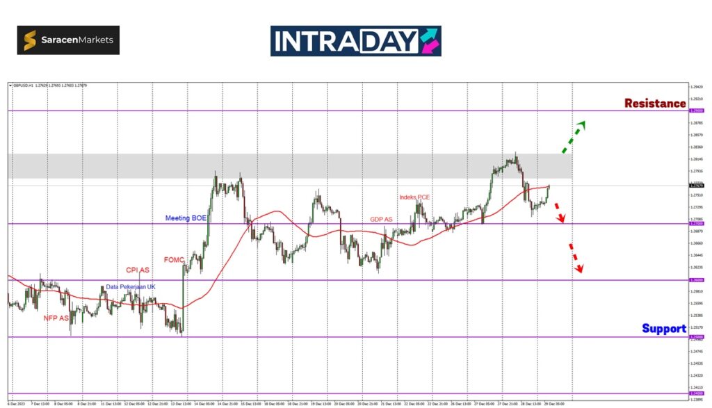 Pada Khamis semalam, kenaikan perlahan diteruskan di sesi Asia hingga sekitar 1.28200 sebelum harga terjun semula ke paras 1.27100.