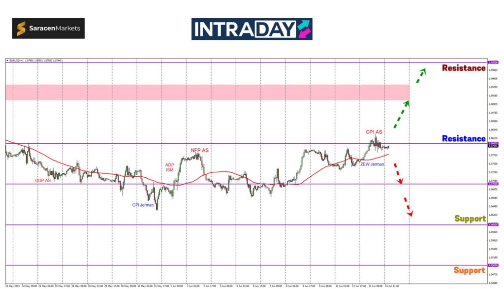 Sekiranya harga berjaya melonjak lebih tinggi, pergerakan bullish yang diteruskan dilihat akan menuju zon tumpuan pada 1.09000.