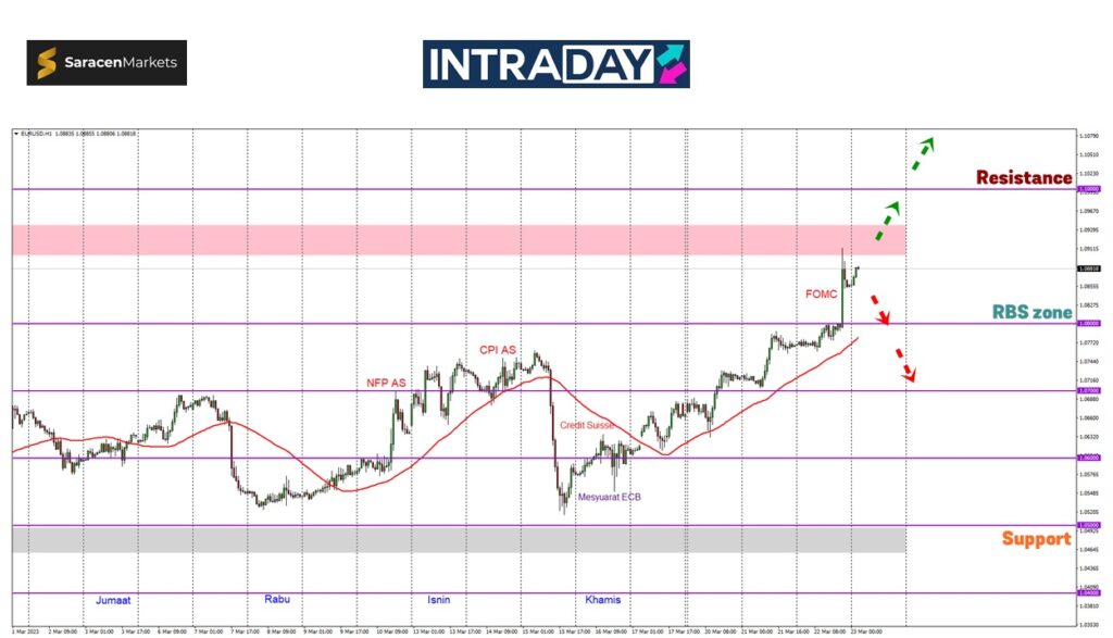 Dengan corak kenaikan yang dipaparkan selama 5 hari berturut-turut, harga dilihat cenderung meneruskan kenaikan dan seterusnya bakal menembusi paras 1.09000 yang telah dicapai.