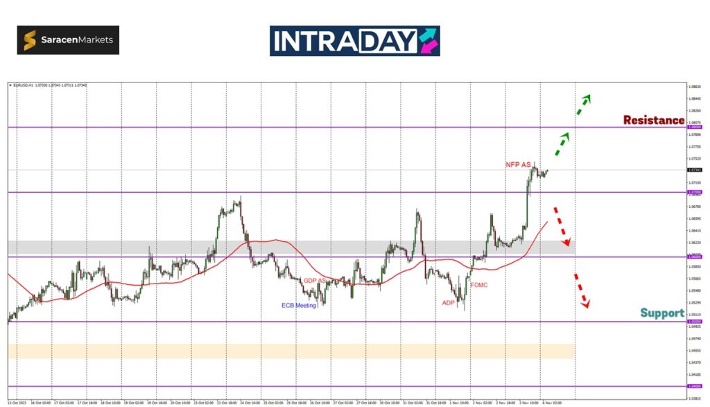 Dengan momentum lonjakan yang berlaku, harga dijangka akan meneruskan kenaikan lebih tinggi lagi minggu ini dengan sasaran untuk mencapai paras 1.08000.