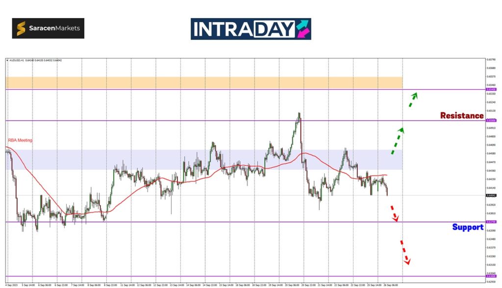 Berbanding US dolar, mata wang AUD dilihat bergerak dalam zon mendatar di antara julat ketinggian 0.65000 dan support pada 0.63600.