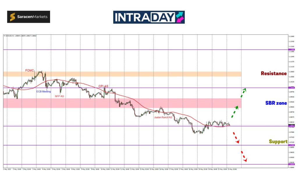 Sekiranya lonjakan berjaya dilakukan, harga akan menuju ke zon 1.09000 untuk menguji rintangan tersebut sebelum menyambung kenaikan ke paras yang lebih tinggi.