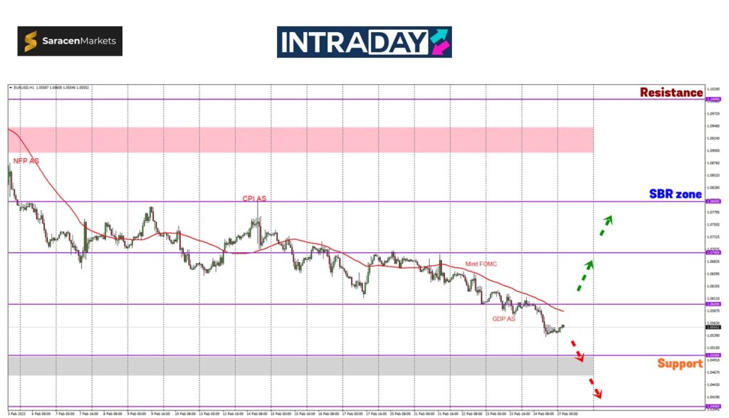 Seperti carta harga pasangan mata wang EUR/USD, paras terendah terbaru 7 minggu dicatatkan dengan penurunan mencecah sekitar 1.05350.