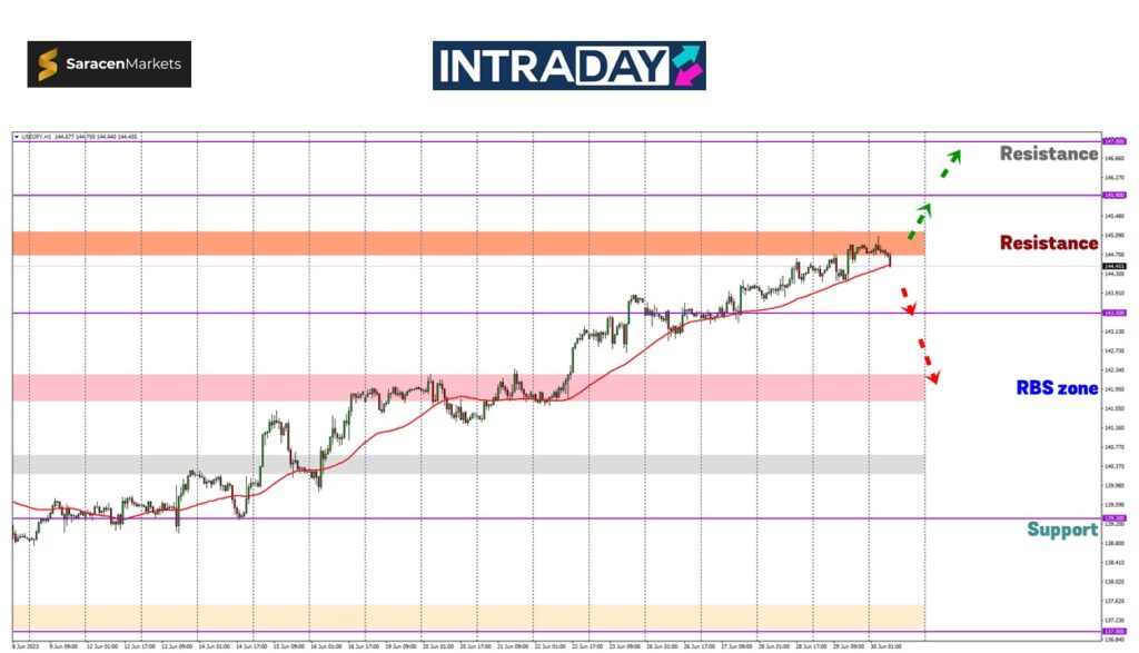 Penurunan harga boleh dijangkakan menuju ke sekitar 143.500 terlebih dahulu sebelum melanjutkan ke zon RBS (resistance become support) pada 142.00.