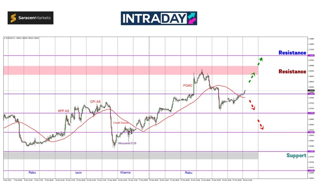 Jika diteliti pada carta harga pasangan mata wang EUR/USD, harga telah berjaya memaparkan kenaikan semula di sesi New York semalam menuju paras 1.08000 selepas bergerak mendatar pada sesi-sesi sebelumnya.