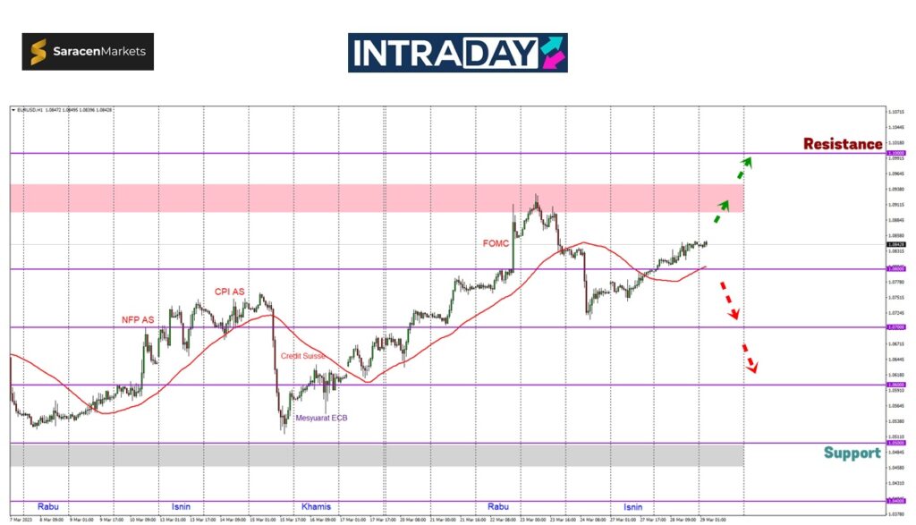 Paras terbaru yang dicapai adalah sekitar 1.08470 dengan isyarat bullish harga yang bergerak di atas paras sokongan Moving Average 50 (MA50) pada rangka masa 1 jam di carta EUR/USD tersebut.