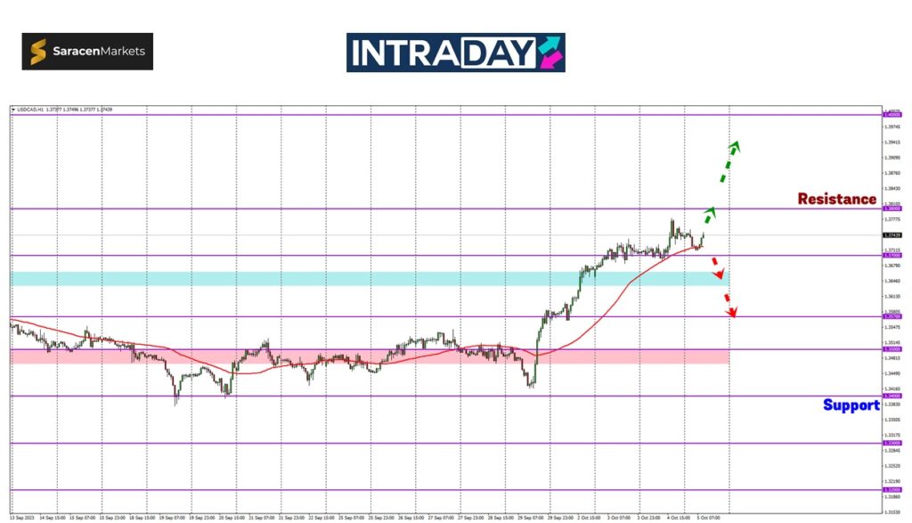 Paras 1.37000 menjadi support buat harga selain harga turut menguji paras sokongan Moving Average 50 (MA50) pada rangka masa 1 jam di carta USD/CAD tersebut yang boleh memberi isyarat untuk pergerakan selanjutnya.