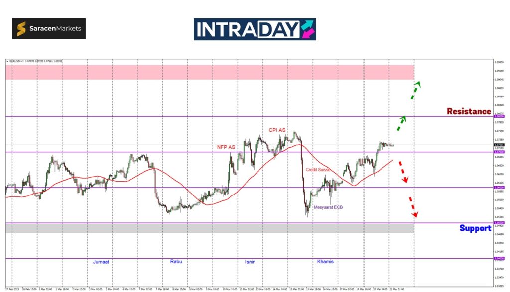 Sekiranya harga masih berjaya mengekalkan corak kenaikan tersebut, harga bakal melanjutkan lagi kenaikan untuk mengatasi paras ketinggian minggu lalu sekitar 1.07600 sebelum menuju pula zon 1.08000.