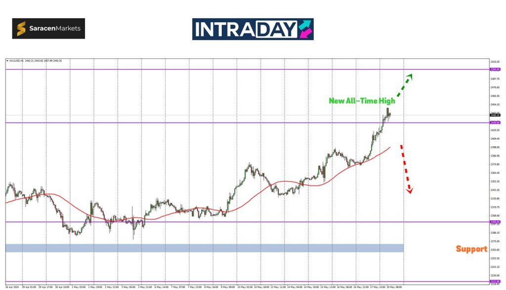 Memerhatikan pergerakan pada carta XAU/USD yang mengukur nilai emas berbanding US dolar, harga emas telah membuat kenaikan sehingga ke penghujung minggu lalu mencapai ketinggian sekitar 2420.00.