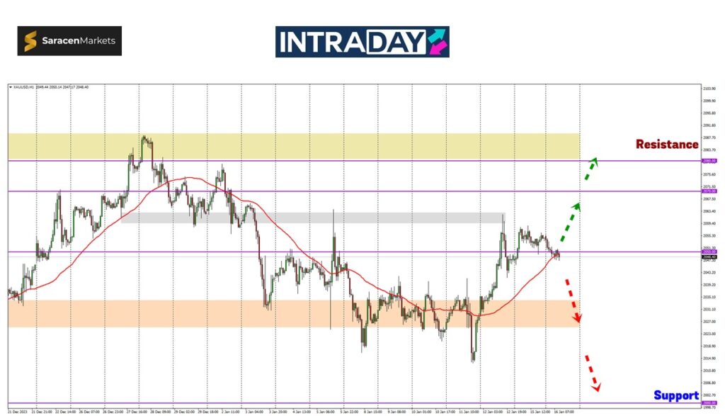 Dapat diperhatikan pada carta XAU/USD yang mengukur nilai emas berbanding US dolar, harga mendatar di atas zon 2050.00 semalam.