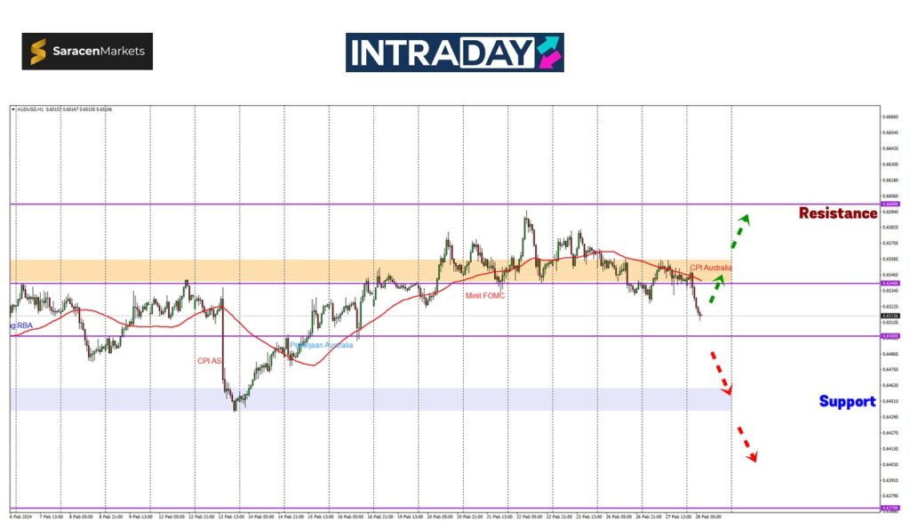 Melepasi paras 0.65000, harga bakal melanjutkan penurunan lebih rendah menuju zon support pada 0.64500.