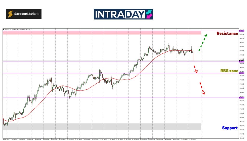 Jika harga kecundang lebih rendah melepasi zon tersebut, pergerakan bearish akan diteruskan menuju sehingga ke sekitar 146.00.