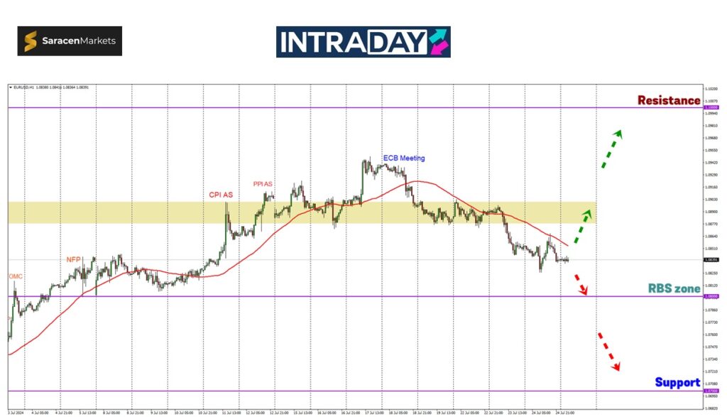 Sekiranya corak bearish harga dikekalkan, harga dijangka akan turun mencecah ke paras sekitar 1.08000 untuk menguji zon penting tersebut.