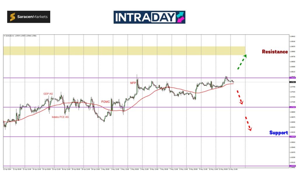 Meneliti pergerakan harga semasa pada carta pasangan mata wang EUR/USD, harga menyambung kenaikan pada dagangan Isnin semalam menuju zon tumpuan pada 1.08000.
