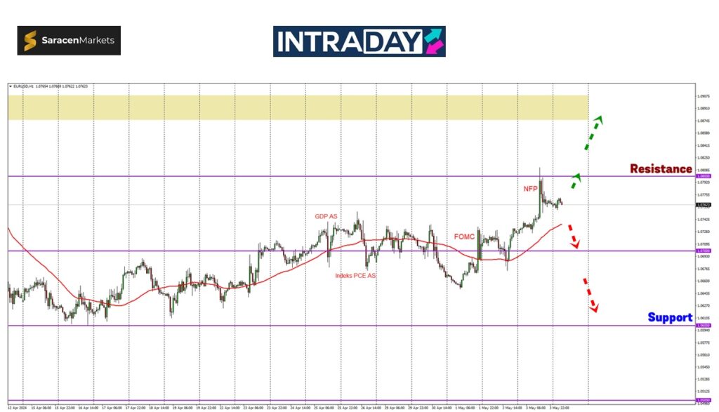 Selepas melepasi paras 1.07000, penurunan harga dijangka akan diteruskan menuju zon support sebelum ini sekitar 1.06000.