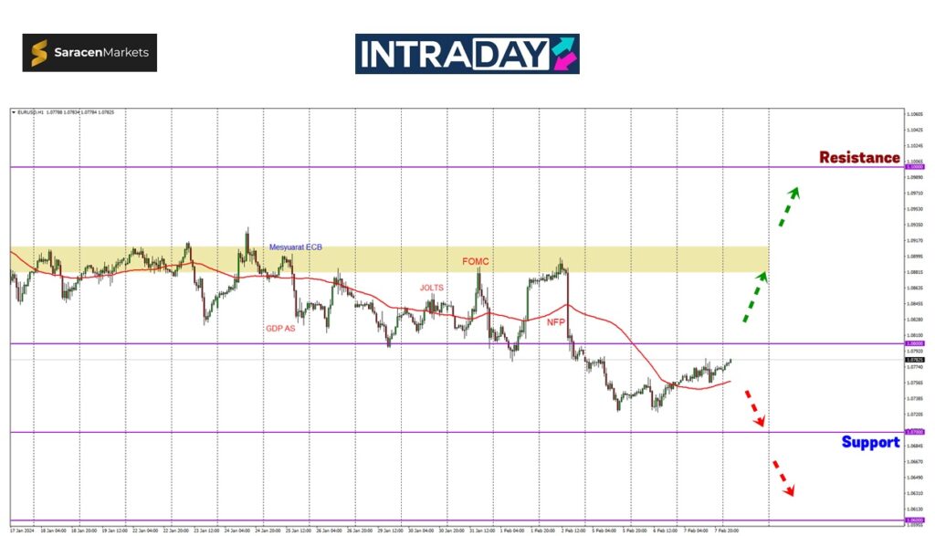 Reaksi harga akan diperhatikan, jika tembus lebih tinggi akan mendorong harga meneruskan pergerakan bullish untuk menuju pula zon rintangan sebelum ini pada 1.09000.