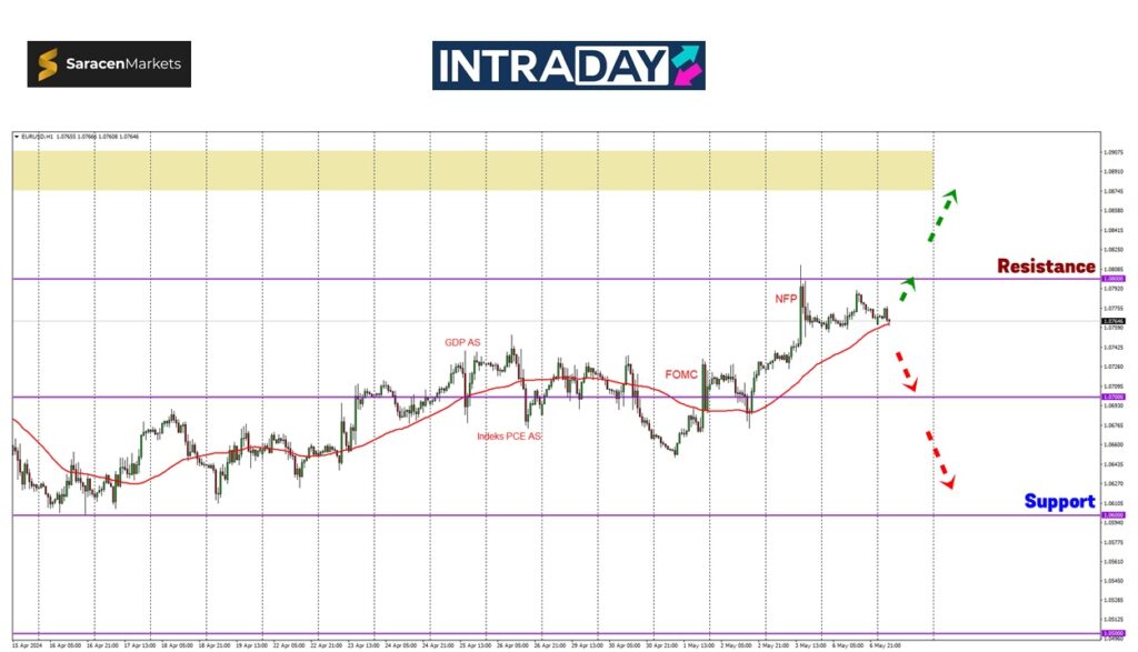 Sekiranya lonjakan berlaku hari ini, rintangan 1.08000 bakal diuji lagi dan berkemungkinan harga akan menembusinya.