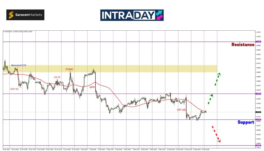 Memerhati pergerakan harga pada carta pasangan mata wang EUR/USD semalam, harga mendatar di atas paras sokongan 1.07000 selepas terjunan harga pada Selasa lalu menguji paras tersebut.