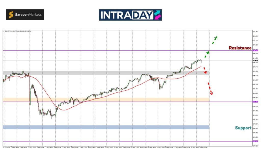 Penurunan awal dilihat akan menuju sekitar 197.00 yang dilihat sebagai zon RBS (resistance become support) yang terhampir.