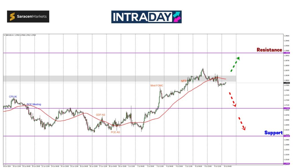Jika dilanjutkan lebih rendah, harga berkemungkinan boleh mencecah sehingga sekitar 1.27000 semula untuk menguji zon RBS (resistance become support) tersebut.