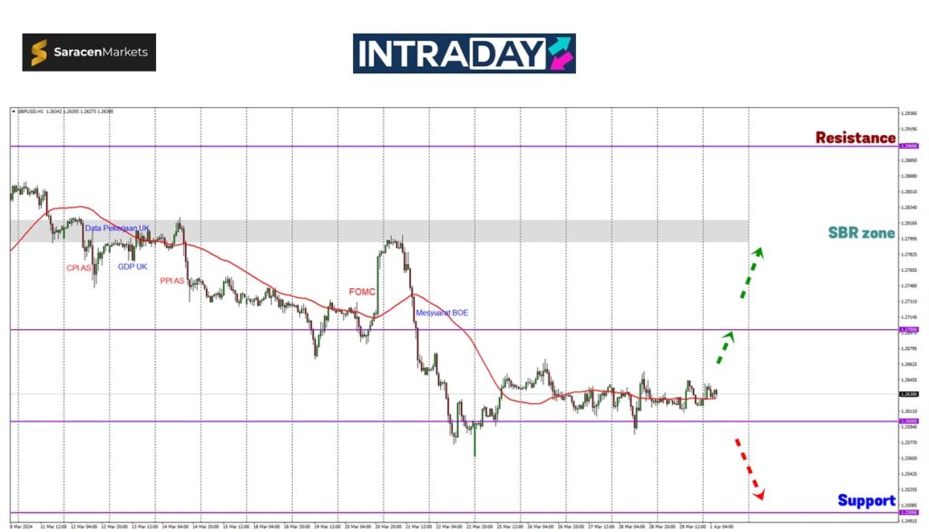 Pergerakan harga pada carta pasangan mata wang GBP/USD dilihat mengekalkan corak mendatar sehingga penutup penghujung minggu lalu sekaligus menamatkan dagangan Mac dan juga suku tahun pertama 2024.
