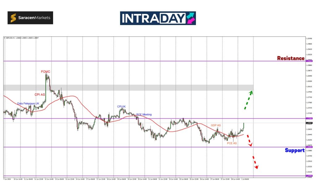 Dapat dilihat pada carta GBP/USD di awal minggu ini, corak kenaikan mula dipaparkan selepas isyarat awal perubahan trend di penghujung minggu lepas dengan pergerakan harga berada di atas garisan sokongan Moving Average 50 (MA50) pada rangka masa 1 jam.