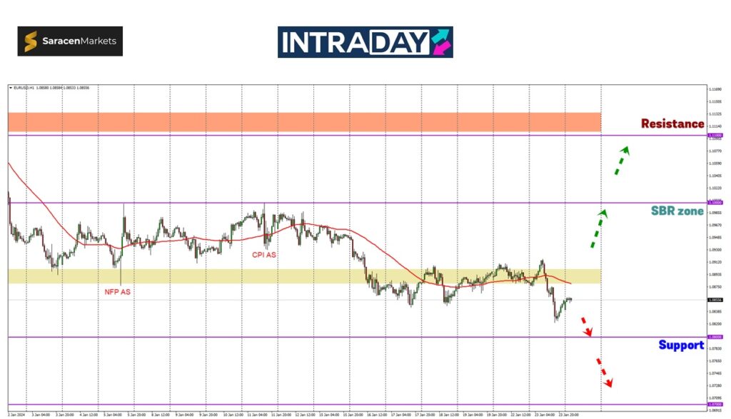 Namun jika harga berjaya melonjak semula, halangan MA50 akan diuji dan harga perlu melepasi semula zon 1.09000 untuk memberi isyarat perubahan trend.