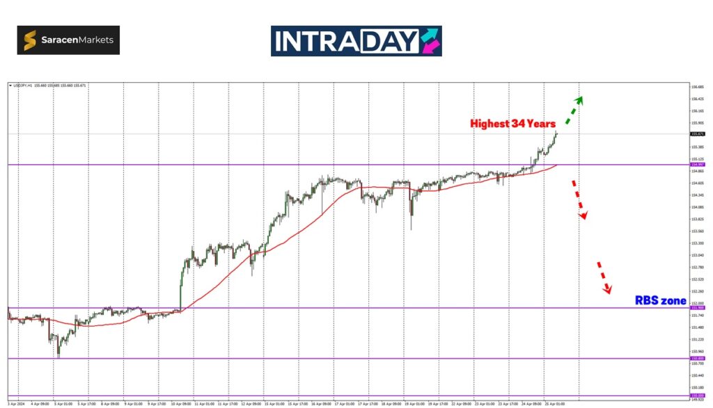 Meneliti carta harga pasangan mata wang USD/JPY, kenaikan yang berlaku pada Rabu semalam telah melepasi paras 155.00 yang mengundang kebimbangan pelabur.