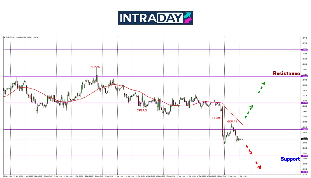 Meneliti pergerakan pada carta pasangan mata wang EUR/USD, terjunan harga diperlihatkan sehingga mencecah 1.03500 ketika reaksi mesyuarat FOMC.