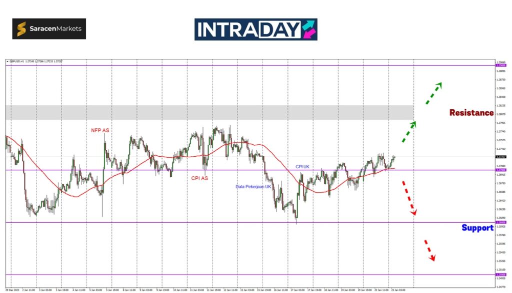 Pada carta GBP/USD, masih lagi pelabur melihat isyarat pergerakan bullish harga yang berada di atas garisan sokongan Moving Average 50 (MA50) pada rangka masa 1 jam dengan bertahan di atas paras 1.27000.