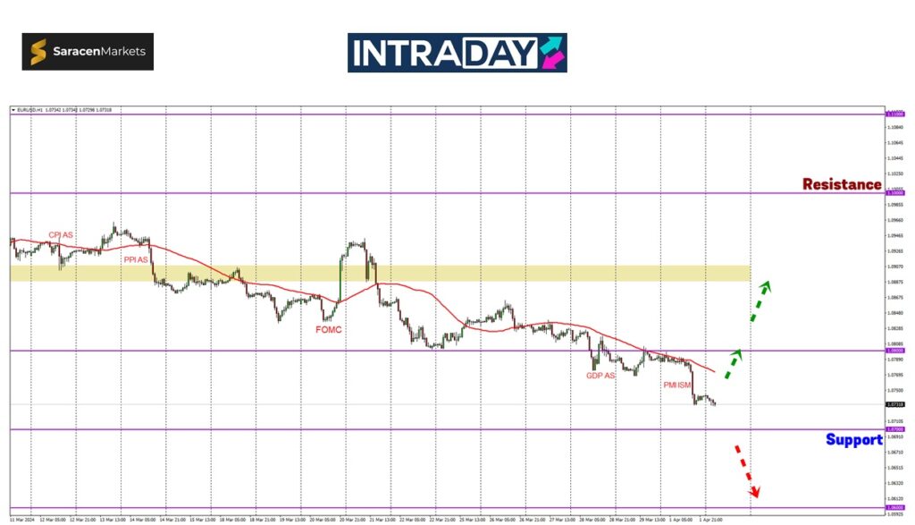 Dengan momentum yang diperlihatkan dan jangkaan pengukuhan berterusan US dolar, harga cenderung untuk menyambung corak penurunan menuju ke zon tumpuan 1.07000.