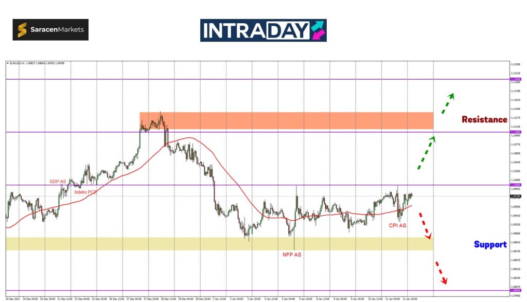 Namun jika US dolar telah mula dapat tarikan semula dan mengukuh, harga bakal ditekan jatuh di bawah MA50 dan menuju zon sokongan terhampir sekitar 1.08800.