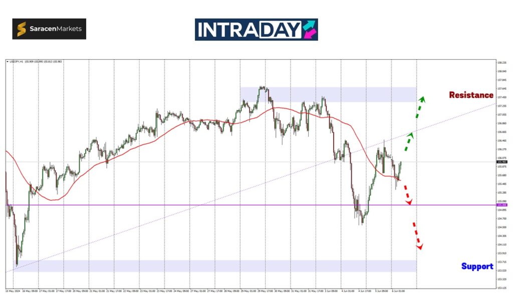 Pergerakan harga pada carta USD/JPY sedikit menurun ke paras 155.400 pada sesi Asia pagi ini (Khamis) namun masih berlegar di atas garisan sokongan MA50.