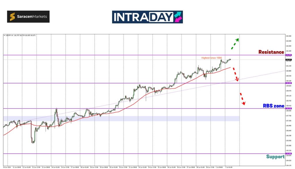 Sehingga dagangan sesi Asia hari ini (Selasa), harga pada carta USD/JPY dilihat mencapai ketinggian terbaru pada 161.700 dengan mengekalkan corak pergerakan bullish.