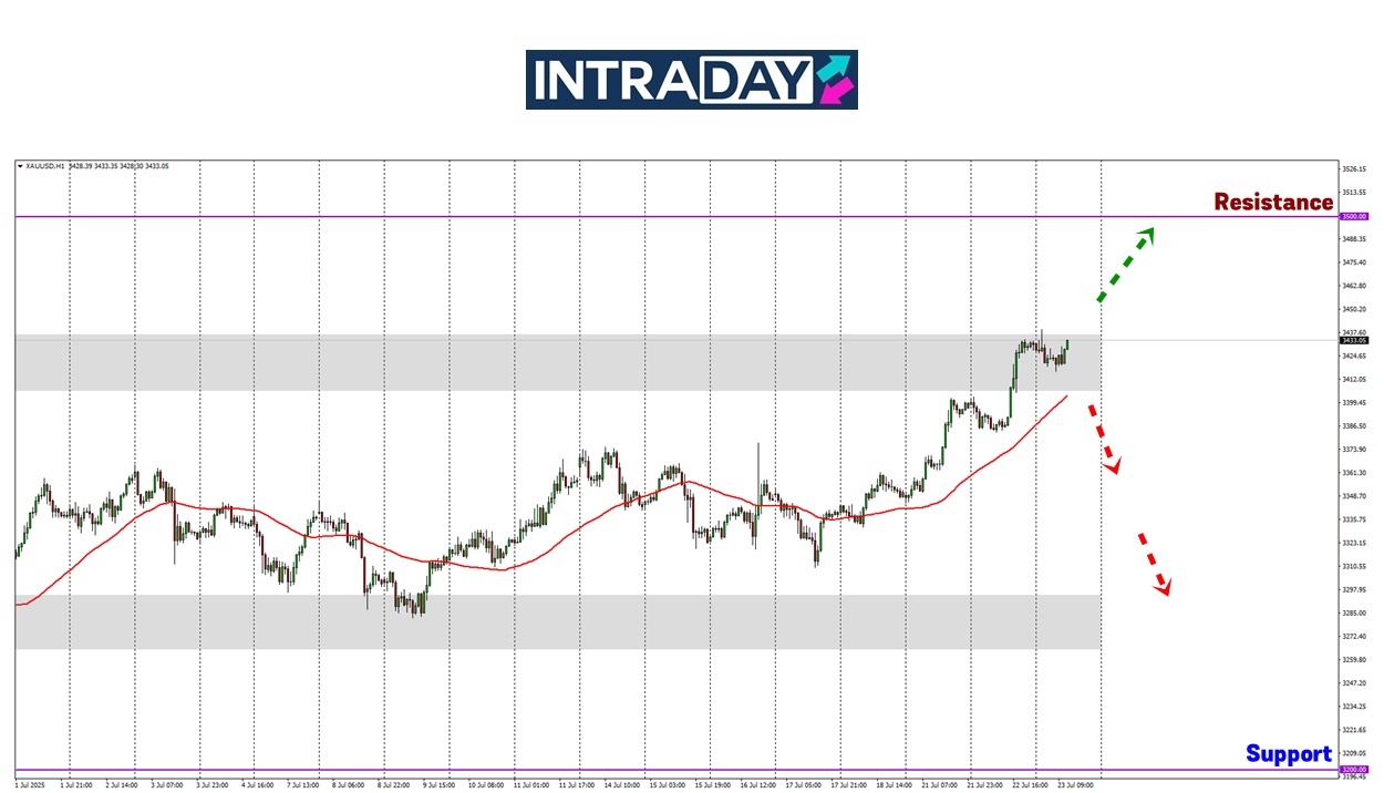 Dengan kenaikan yang telah pun melepasi 3400.00, sasaran adalah pada 3500.00 dengan harga berpotensi untuk memecah rekod baharu emas.