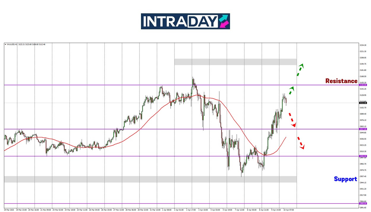 Pada carta XAU/USD yang mengukur nilai emas berbanding US dolar, harga yang memulih naik dari paras 3000.00 melepasi rintangan pada zon 3050.00.