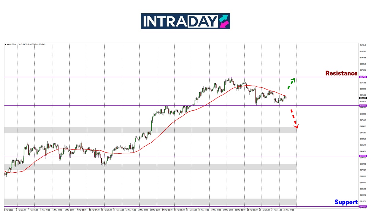 Meneliti carta XAU/USD yang mengukur nilai emas berbanding US dolar, harga masih berlegar di atas zon 3000.00 pada pembukaan awal minggu ini selepas penurunan harga ke paras tersebut minggu lalu.