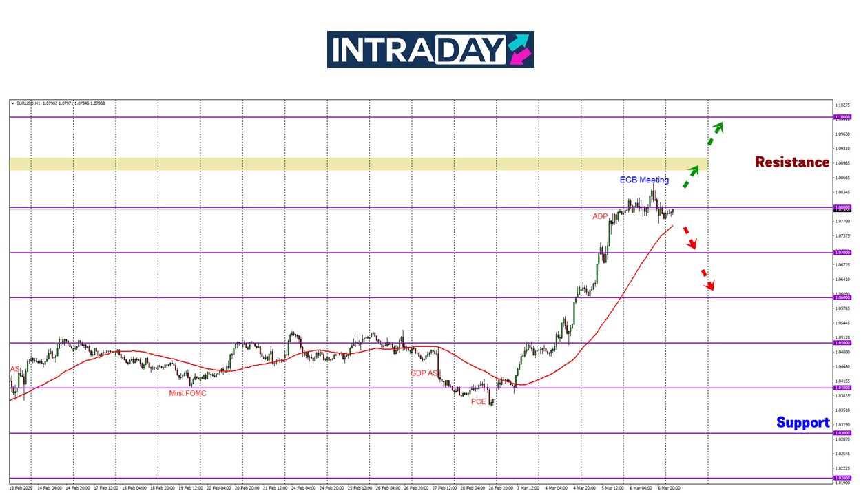 Meneliti pergerakan harga pada carta pasangan mata wang EUR/USD, harga telah mencapai ketinggian sekitar 1.08500 pada Khamis semalam sebelum berlaku penurunan semula susulan reaksi keputusan mesyuarat ECB.