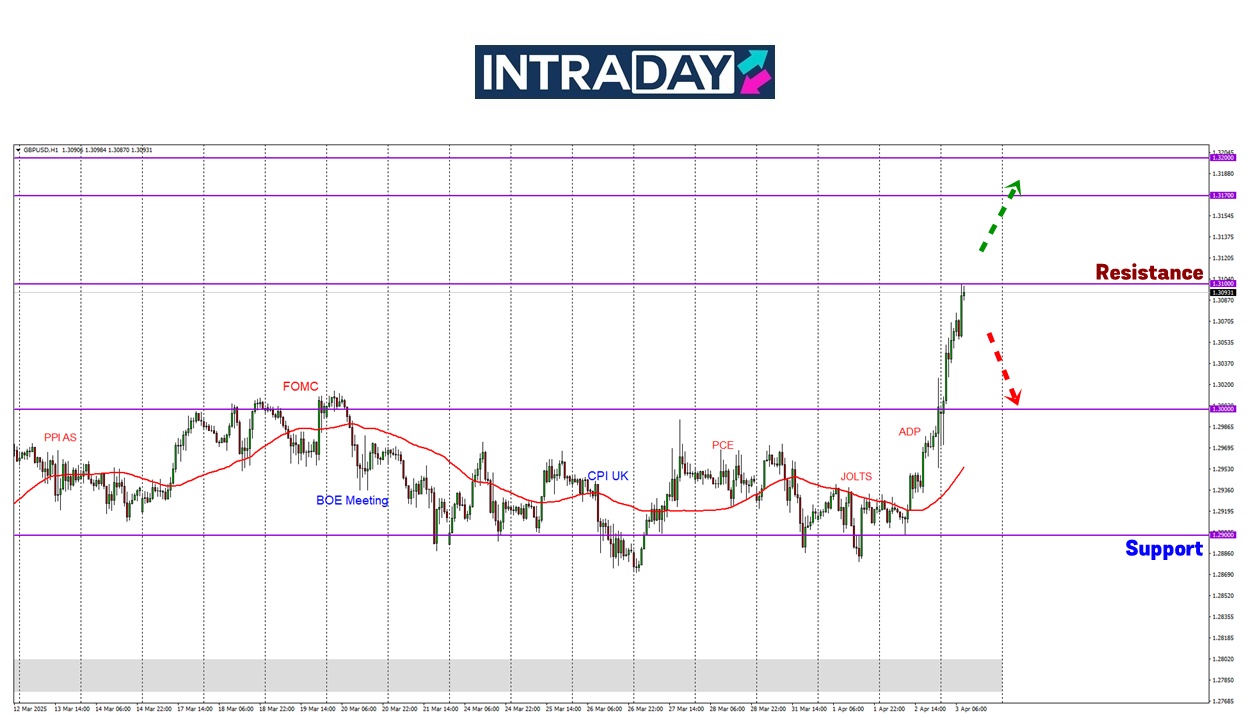 Harga melonjak dari zon sokongan 1.29000 semalam sehingga melepasi rintangan 1.30000 ketika reaksi pengumuman tarif Trump tersebut.
